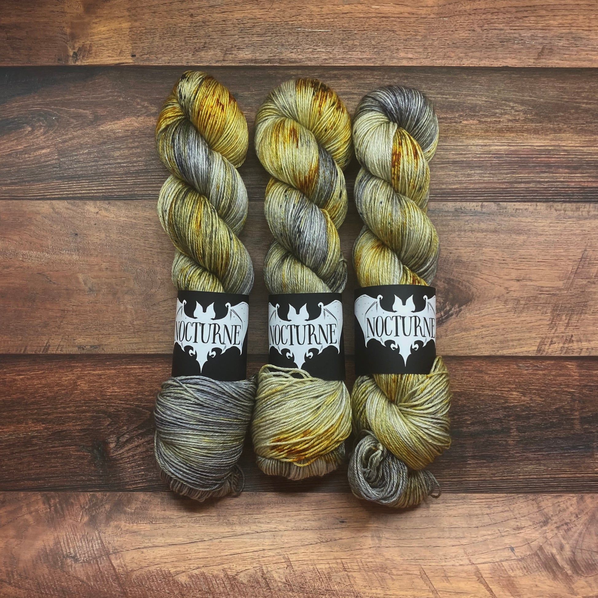 Apollo is a variegated golden yellow, gray and white colourway with golden and black speckles.