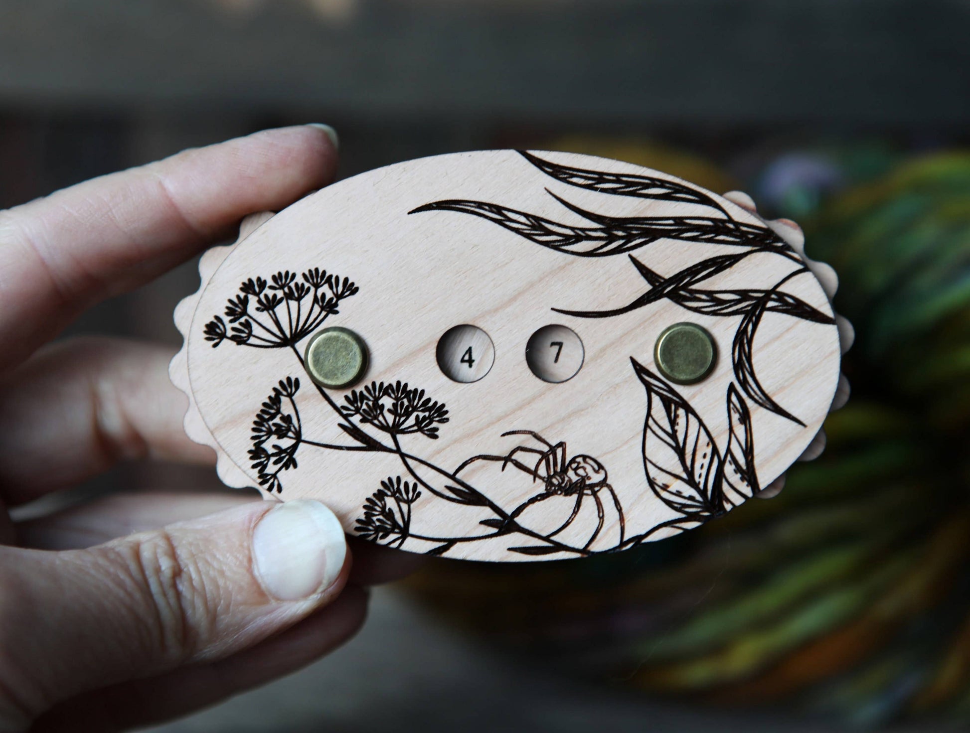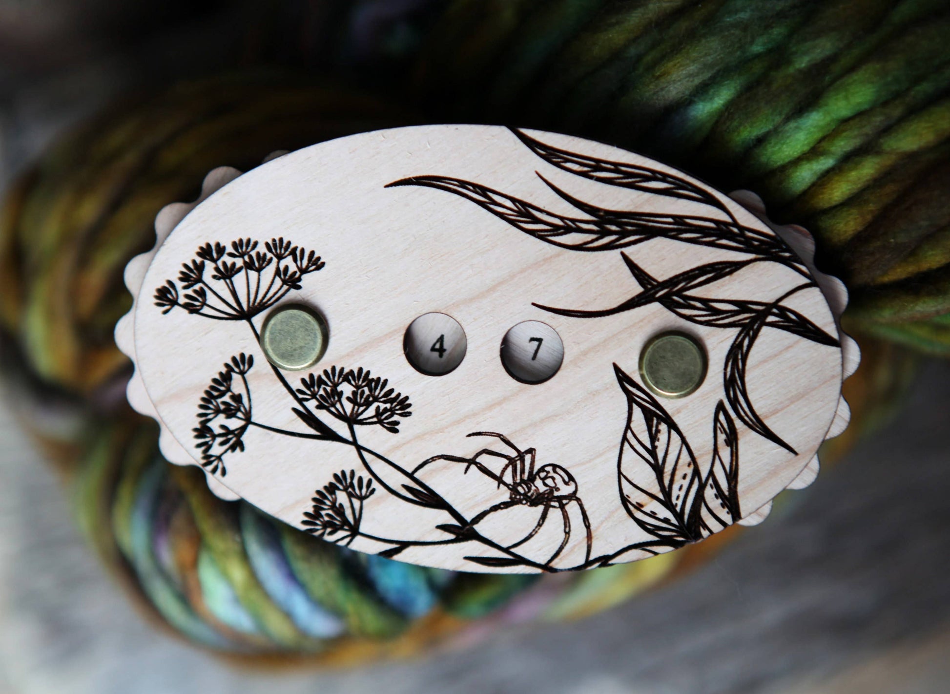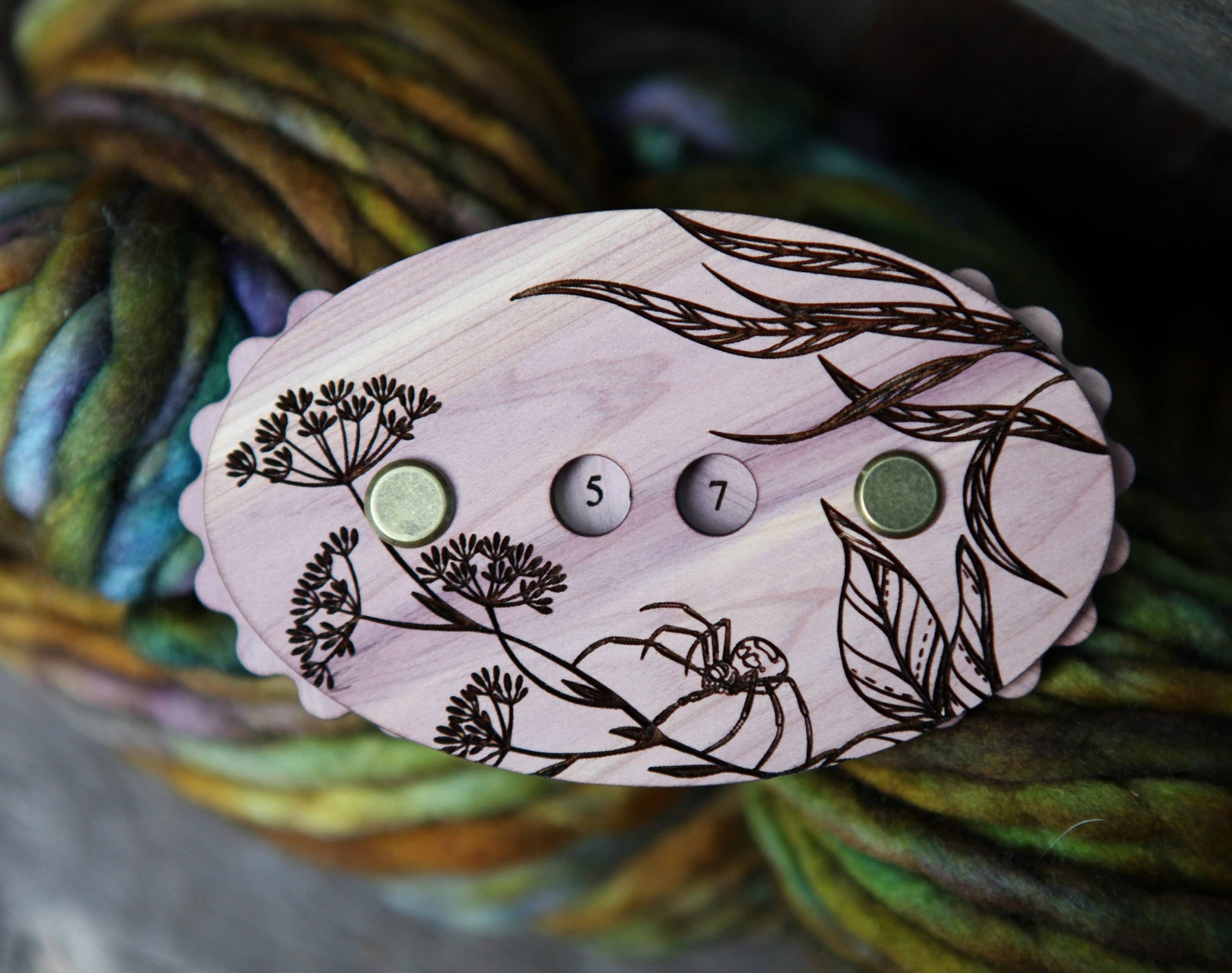 Keep track of your rows with this wooden Row Counter, a beautifully crafted tool for knitters, crocheters, and anyone else who wants to keep track of numbers. The design features a black widow spider climbing a yarrow branch surrounded by forest plants, blending natural beauty with practical use.
