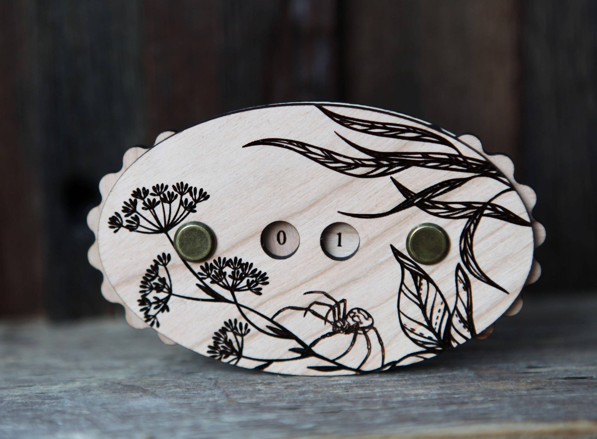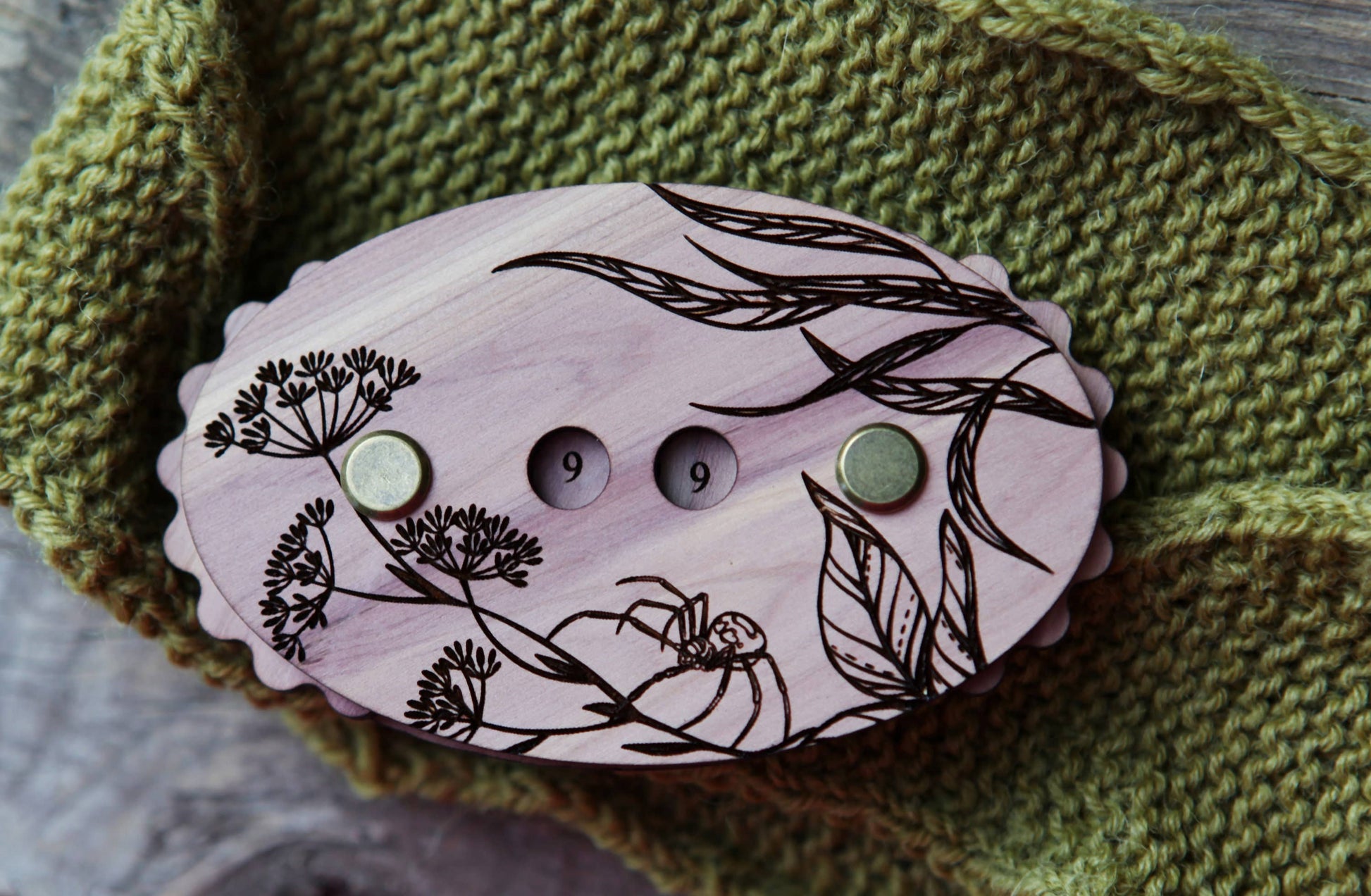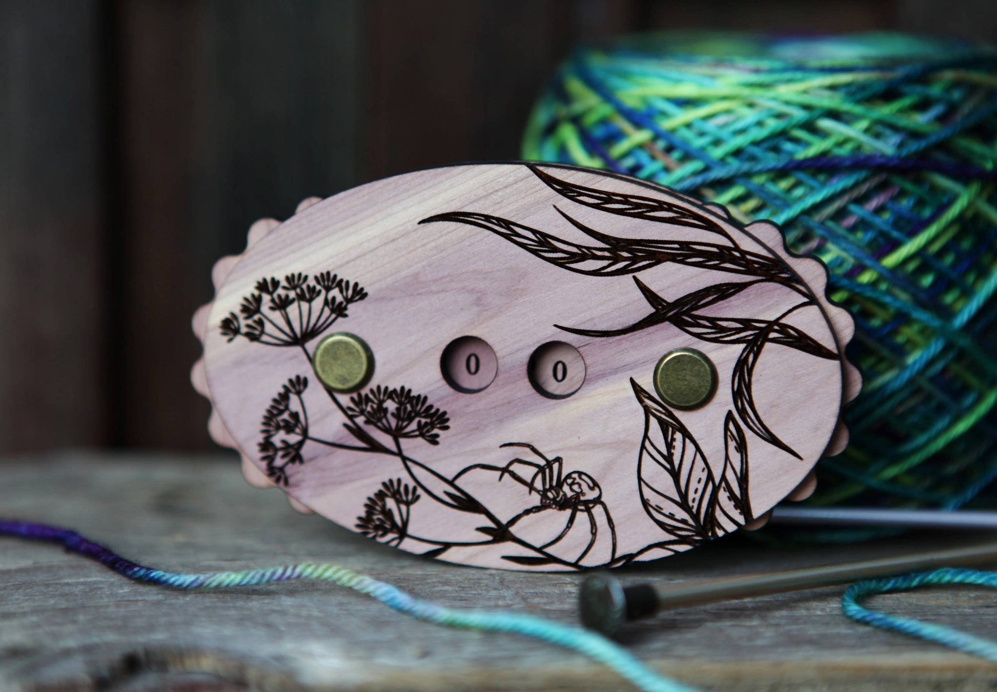 Keep track of your rows with this wooden Row Counter, a beautifully crafted tool for knitters, crocheters, and anyone else who wants to keep track of numbers. The design features a black widow spider climbing a yarrow branch surrounded by forest plants, blending natural beauty with practical use.