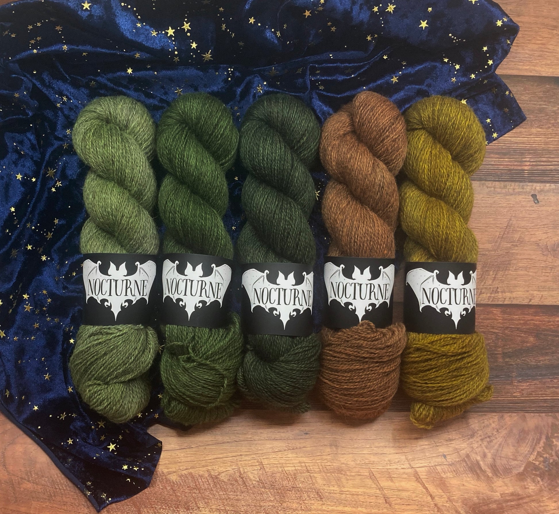 The set contains five 100g skeins in rich, autumnal semi-solid colours, three in various shades of green and two accent colours in caramel brown and mustard yellow. Despite it being a non-superwash base, it takes dye beautifully and allows for even coverage, with gorgeous heathering integral to the yarn. I was inspired by a handful of typical British bogeymen, from all corners of the country: