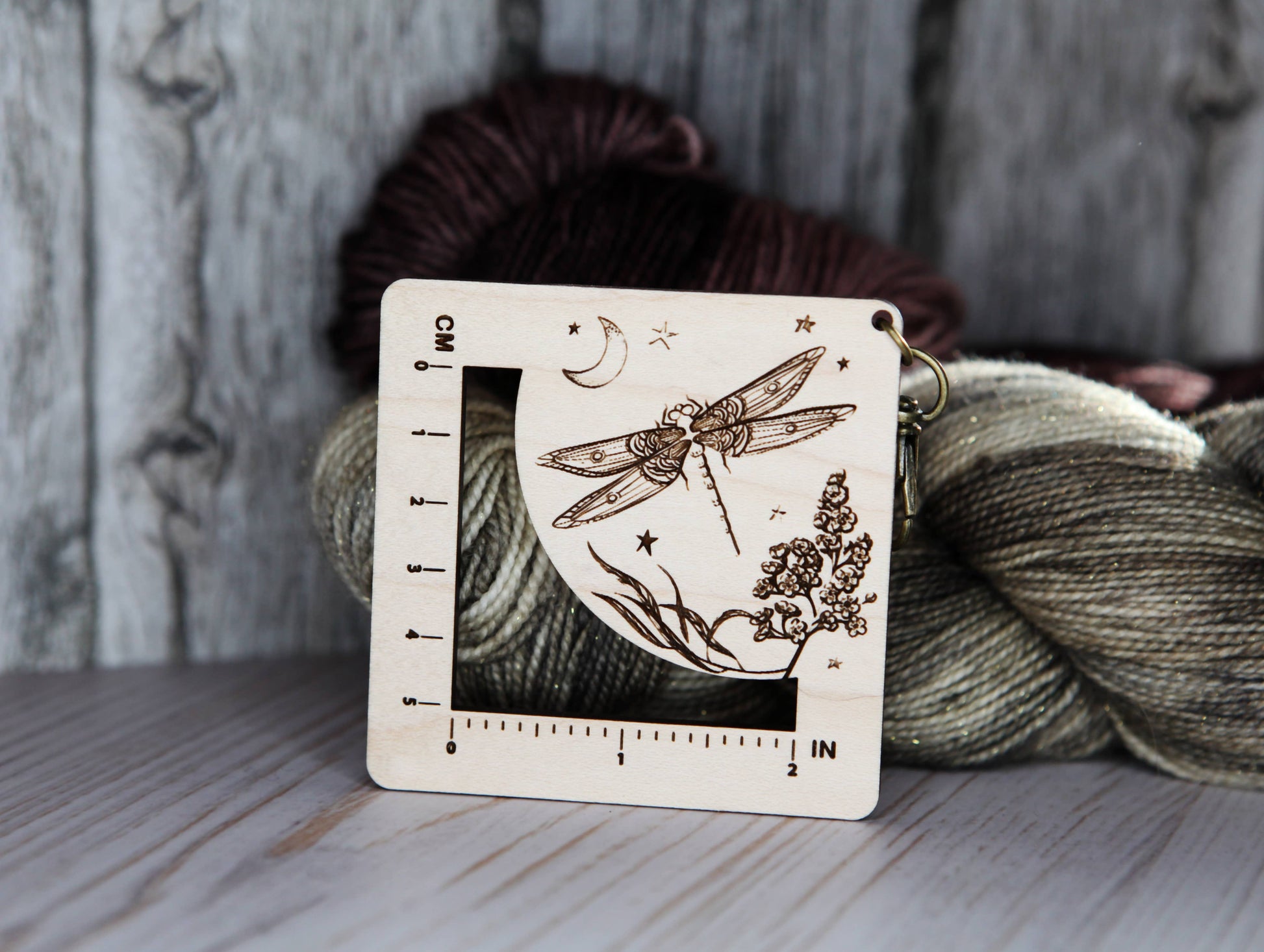 Measure your knitting or crochet swatches in style with this beautifully crafted Gauge Ruler. Made from maple wood and adorned with a Dragonfly, this tool combines function and artistry.