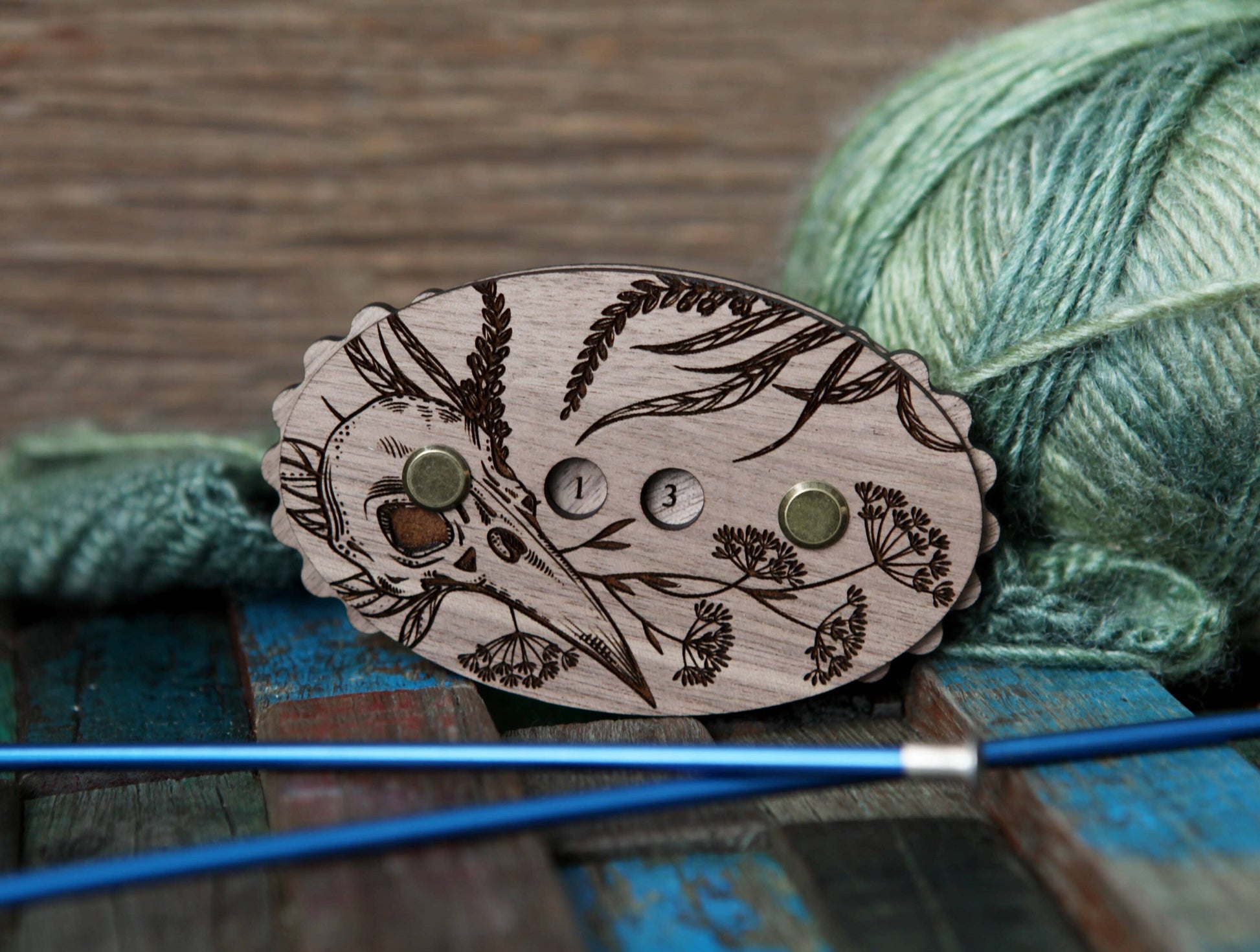 Keep track of your rows with this wooden Row Counter, a beautifully crafted tool for knitters, crocheters, and anyone else who wants to keep track of numbers. The design features a Raven skull, blending Gothic beauty with practical use.