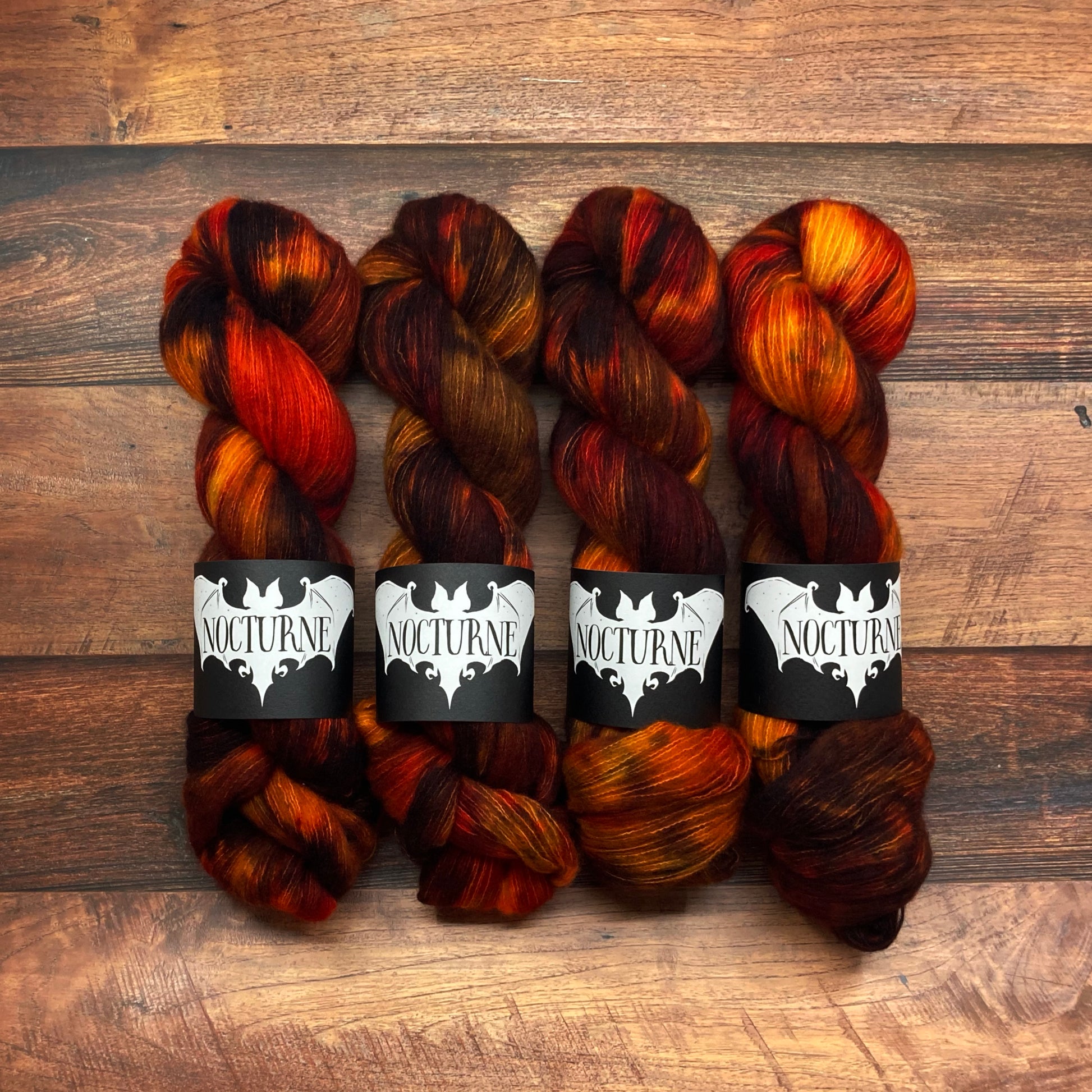 Samhain is a variegated orange-red-yellow colourway, with dark brown streaks and brown speckles.